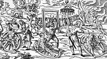 The survival time after being "wheeled" or "broken" could be extensive. Accounts exist of a 14th-century murderer who remained conscious for three days after undergoing the punishment.[3] In 1348, during the time of the Black Death, a Jewish man named Bona Dies underwent the punishment. The authorities stated he remained conscious for four days and nights afterwards.[4] In 1581, the possibly fictitious German serial killer Christman Genipperteinga remained conscious for nine days on the breaking wheel before expiring, having been deliberately kept alive with "strong drink".[5]