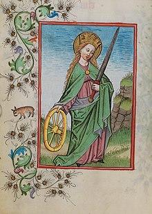 Medieval hagiographies, such as the Legenda sanctorum, record that St. Catherine of Alexandria was sentenced to be executed on one of these devices for refusing to renounce her Christian belief, which thereafter became known as the Catherine wheel, also used as her iconographic attribute. It is said the wheel miraculously broke when she touched it; she was then beheaded.[25] As an attribute it is usually shown broken in a small version beside her, or sometimes as a miniature she holds in her hand; the sword then used is also often shown.