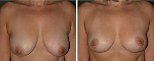 In the woman afflicted with gigantomastia (>1,000 gm overweight per breast), the average breast-volume reduction diminished her oversized bust by three (3) brassière cup-sizes.[4] The surgical reduction of abnormally enlarged breasts resolves the physical symptoms and the functional limitations that a bodily disproportionate bust imposes upon a woman; thereby it improves her physical and mental health.[5][6][7][8] Afterwards, the woman's ability to comfortably perform physical activities previously impeded by oversized breasts improves her emotional health (self-esteem) by reducing anxiety and lessening psychological depression.[9]