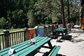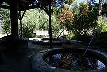 Behind the Lodge and closer to the river are four hot tubs which lie in a concrete patio, each comfortably seating four people. These are known as the Spiral Tubs and they receive their mineral water supply from a nearby geothermal well. The Spiral Tubs also include a mineral water cold plunge: the mineral water is cooled by means of copper pipes submerged in river water. Temperatures for all the hot tubs are regulated and range from 100 to 110 °F (38 to 43 °C). In 2020 the co-op installed a series of semi-private claw-foot tubs beyond the spirals, allowing for sanitary, single-use soaking in response to COVID-19.