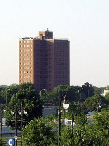 The Brewster Project and Frederick Douglass Apartments were built between 1935 and 1955,[2] and were designed by Harley, Ellington & Day of Detroit. The Brewster Project began construction in 1935, when First Lady Eleanor Roosevelt broke ground for the 701-unit development; the first phase, consisting of low-rise apartment blocks, was completed in 1938. An expansion of the project completed in 1941 brought the total number of housing units to 941. The Frederick Douglass Apartments, built immediately to the south of the Brewster Project, began construction in 1942 with the completion of apartment rows, two 6-story low-rises, and finally six 14-story high rises completed between 1952 and 1955. The combined Brewster-Douglass Project was five city blocks long, and three city blocks wide,[3] and housed anywhere between 8,000 and 10,000 residents, at its peak capacity.
