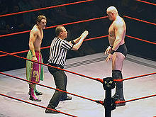 In late 2002, Kendrick signed a contract with WWE but was unable to compete until he completed his time in the independent circuit.[2] He made his WWE debut on the edition of January 11, 2003 of Velocity under the gimmick of a mascot representing the local sports team of the town in which he was competing.[22] He continued wearing masks for several weeks, each time competing under a different identity.[23][24][25] After acting as a telegram deliverer for Big Show to Undertaker, and getting a Last Ride for his troubles, he showed up the following week and began a series of events trying to impress the then General Manager of Smackdown! Stephanie McMahon in order to earn a contract for the WWE, including trying to last five minutes in a match with Kurt Angle. He eventually earned himself a contract on the March 20, 2003 episode of Smackdown! by defeating Shannon Moore. His first major storyline within WWE came on the May 1, 2003 episode of SmackDown!. He reverted to his former "Spanky" ring name after he interrupted a promo by John Cena.[26] The two feuded over their similar hip hop gimmicks, until May 22.[27] On October 30, Spanky began teaming with Paul London until January 13, 2004 when Kendrick left WWE to return to Zero1.[19][28][29]