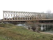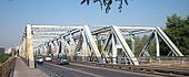 It was first given to public in 1913. It was exploded by the retreating German army in 1945. A new, temporary steel structure was built on the bases, from military materials which enabled rapid construction. The trains could use it with max. 15 km/h. It was finally demolished in 2008, when the bases were completely renovated and a new steel structure was placed onto them. This technically enables 160 km/h transit speeds, but for safety concerns related to the curves of the railway in the city, the maximum allowed transit speed is 80 km/h.