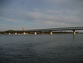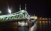 Rákóczi Bridge connects Buda and Pest across the Danube. It is renamed after the Hungarian leader Francis II Rákóczi. Built alongside the Southern Rail Bridge, this bridge is the southernmost roadway bridge in the capital; it was inaugurated in 1995. By 2015, tram line 1 was extended across Rákóczi Bridge to Buda (the western side of the city), to Fehérvári út where it connects to tram lines 18, 41 and 47.[3] On the Buda side a section of the tracks is covered by grass.[4]