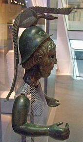 At Birrens (the Roman Blatobulgium), archaeologists have found a Roman-era stone bas-relief of a female figure; she is crowned like a tutelary deity, has a Gorgon's head on her breast, and holds a spear and a globe of victory like the Roman goddesses Victoria and Minerva.[15] The inscription mentioned above assures the identification of the statue as Brigantia rather than Minerva. A statue found in Brittany also seems to depict Brigantia with the attributes of Minerva.