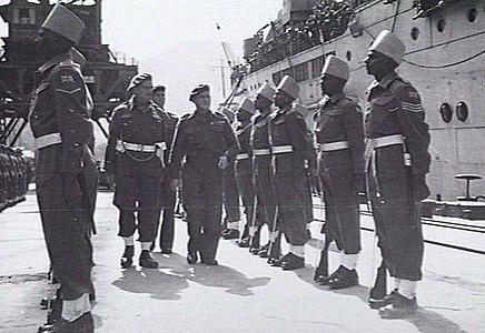 Major General David Cowan, General Officer Commanding BRINDIV, inspects Indian troops at Kure, 30 March 1946.