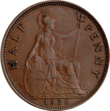 The British pre-decimal halfpenny (1/2d) coin, usually simply known as a ha'penny (pronounced /ˈheɪpəni/), historically occasionally also as the obol[1] and once abbreviated ‘ob’ (from the Latin ‘obulus’),[2] was a unit of currency that equalled half of a penny or 1/480 of a pound sterling. Originally the halfpenny was minted in copper, but after 1860 it was minted in bronze. In the run-up to decimalisation it ceased to be legal tender from 31 July 1969.[3] The halfpenny featured two different designs on its reverse during its years in circulation. From 1672 until 1936 the image of Britannia appeared on the reverse, and from 1937 onwards the image of the Golden Hind appeared.[4] Like all British coinage, it bore the portrait of the monarch on the obverse.[5]