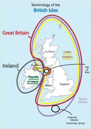 - ^ Oxford English Dictionary: "British Isles: a geographical term for the islands comprising Great Britain and Ireland with all their offshore islands including the Isle of Man and the Channel Islands."