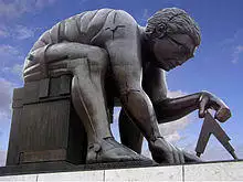 The new library was designed specially for the purpose by the architect Colin St John Wilson[12] in collaboration with his wife MJ Long, who came up with the plan that was subsequently developed and built.[25] Facing Euston Road is a large piazza that includes pieces of public art, such as large sculptures by Eduardo Paolozzi (a bronze statue based on William Blake's study of Isaac Newton) and Antony Gormley. It is the largest public building constructed in the United Kingdom in the 20th century.[26][27]