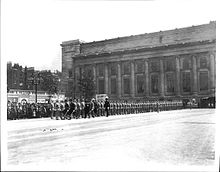 In 1895, Parliament gave the Museum Trustees a loan of £200,000 to purchase from the Duke of Bedford all 69 houses which backed onto the Museum building in the five surrounding streets - Great Russell Street, Montague Street, Montague Place, Bedford Square and Bloomsbury Street.[41] The Trustees planned to demolish these houses and to build around the West, North and East sides of the Museum new galleries that would completely fill the block on which the Museum stands. The architect Sir John James Burnet was petitioned to put forward ambitious long-term plans to extend the building on all three sides. Most of the houses in Montague Place were knocked down a few years after the sale. Of this grand plan only the Edward VII galleries in the centre of the North Front were ever constructed, these were built 1906-14 to the design by J.J. Burnet, and opened by King George V and Queen Mary in 1914. They now house the Museum's collections of Prints and Drawings and Oriental Antiquities. There was not enough money to put up more new buildings, and so the houses in the other streets are nearly all still standing.