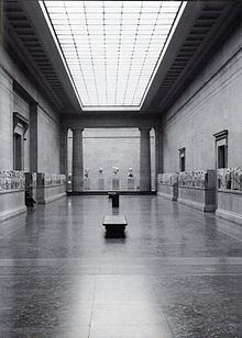 In 1953 the Museum celebrated its bicentenary. Many changes followed: the first full-time in house designer and publications officer were appointed in 1964, A Friends organization was set up in 1968, an Education Service established in 1970 and publishing house in 1973. In 1963 a new Act of Parliament introduced administrative reforms. It became easier to lend objects, the constitution of the Board of Trustees changed and the Natural History Museum became fully independent. By 1959 the Coins and Medals office suite, completely destroyed during the war, was rebuilt and re-opened, attention turned towards the gallery work with new tastes in design leading to the remodelling of Robert Smirke's Classical and Near Eastern galleries.[31] In 1962 the Duveen Gallery was finally restored and the Parthenon Sculptures were moved back into it, once again at the heart of the museum.[g]