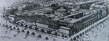 In 1802 a Buildings Committee was set up to plan for expansion of the museum, and further highlighted by the donation in 1822 of the King's Library, personal library of King George III's, comprising 65,000 volumes, 19,000 pamphlets, maps, charts and topographical drawing.[20] The neoclassical architect, Sir Robert Smirke, was asked to draw up plans for an eastern extension to the Museum "... for the reception of the Royal Library, and a Picture Gallery over it ..."[21] and put forward plans for today's quadrangular building, much of which can be seen today. The dilapidated Old Montagu House was demolished and work on the King's Library Gallery began in 1823. The extension, the East Wing, was completed by 1831. However, following the founding of the National Gallery, London in 1824,[e] the proposed Picture Gallery was no longer needed, and the space on the upper floor was given over to the Natural History collections.[22]