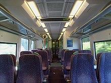 As delivered each train consisted of three cars; one end car (DMOSB) had 64 standard class seats in [2+2] arrangement with a mixture of facing seats with tables and airline style arrangements, as well as luggage and bicycle facilities; the middle car (MOSL) had 72 standard class seats also in a mixture of arrangements in [2+2] formation, and incorporated a standard toilet; the other end car (DMOCLW) had a further 18 standard class seats, and 15 [2+1] arrangement first class seats, plus a wheelchair space, and a reduced mobility access toilet.[5][36] Toilets were supplied by Driessen, seats by Grammer and Fainsa, and air conditioning from Air International Transit.[5]