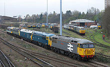 However, BREL's Doncaster Works were in severe demand at this time and its resources would be stretched to meet these targets despite the ample fabrication facilities available on site, as a lack of numbers of skilled personnel to manufacture mechanical components was the primary limitation on capacity at Doncaster.[4] To address this constraint, Ashford, Eastleigh and Swindon Works were also involved in the fabrication of sub-assemblies to successfully satisfy the production timetable; specically, roofs, fuel tanks and cab frames were produced at Ashford, while cab desks were built at Eastleigh, and radiator housings were supplied from Swindon.[4] Subsiquently, final assembly of the type was transferred from Doncaster Works to Crewe, allowing the latter to commence work on construction of the new Class 58 heavy freight locomitive.[4]