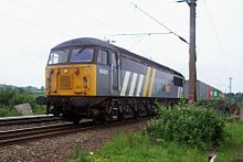 On 4 August 1976, 56001 and 56002 were loaded for shipping from Zeebrugge to Harwich.[11] They were towed from Harwich to Tinsley on 7 August.[11] Initial trials were conducted on the Settle-Carlisle Line.[12] Subsequent examples (of the Romanian deliveries) went to Barrow Hill depot for preparation and subsequent commissioning on test trains from Tinsley, usually to Peterborough West Yard. The test train consisted of a rake of rail-carrying flat wagons, with a former East Coast Metro-Cammell Pullman vehicle marshalled immediately behind the locomotive. Testing of Doncaster-built examples was completed using the traditional Doncaster works test train, running north along the East Coast Main Line.