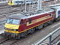 Virgin Trains contracted Class 87s were replaced by English, Welsh and Scottish Railway (EWS) Class 90s in March 1998.[11][12] An agreement was reached in 2006 to paint a number of Class 90s into First ScotRail colours, for exclusive use hauling the Caledonian Sleeper. In 2015, with Serco taking over the Caledonian Sleeper franchise, the haulage contract went to GB Railfreight, who chose to use Class 92s on the West Coast Main Line. However, due to mechanical problems, a Class 90 locomotive was used; thus was initially hired by DB Cargo UK, but later changed to Freightliner.[13][14][15] Operation ended in October 2019.