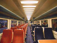 The original coaches were delivered in HST sets for Western Region (Class 253) with Trailer First (TF), Trailer Restaurant Unclassified Kitchen (TRUK), Trailer Second (TS), and Trailer Buffet Second (TRSB) cars in the formation TF-TF-TRUK-TS-TRSB-TS-TS. Complaints from guards about engine noise in the guards' compartments in the power cars led to the Trailer Guard Second (TGS) in 1980, based on the TS but with the end vestibule and one seating bay replaced by a guard's compartment. This replaced the last TS in all sets from 1980 onwards. Sets delivered for Eastern Region (Class 254) contained eight coaches, originally in the formation TF-TF-TRUK-TS-TS-TRSB-TS-TS. The TRUK cars were quickly replaced by a TS on the Western Region and most had been replaced on the Eastern Region by 1985 (many later rebuilt into loco-hauled buffet cars). TRUB cars (Trailer Restaurant Unclassified Buffet) were built from 1978 to replace the TRUK cars, and these were reclassified as TRFB (Trailer Restaurant First Buffet) from 1985 on the Eastern and London Midland Regions and from 1989/90 on the Western Region. The original interiors were fitted out fully carpeted with InterCity 70 seats. First Class had orange and red stripes on both carpet and seating,[18] whilst Standard Class had a blue and green scheme.[19] From May 1987 onwards, both HST and Mark 3 loco hauled sets were repainted and refurbished into the Intercity swallow livery.[20]