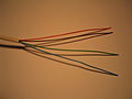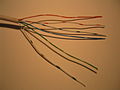 Shown below are the cabling arrangements for both 4-wire and 6-wire cable. Initially 4-wire was used and many older installations still use it, then the 6-wire became the new standard, but the 4-wire has latterly been reissued to all Openreach technicians as part of cost savings. Modern 4-wire however is the same diameter as 6-wire to allow technicians to retain existing tacking guns and cable clips. Note that the wires in the 6-wire cable are coloured with two colours in a ratio of four to one in length, with the first colour mentioned being the predominant one, e.g. if the indicated colour of the wire is W-B then the wire will be coloured white for 12 mm, then blue for 3 mm and so on. (In other words, it looks like a white wire with blue patches on it.)