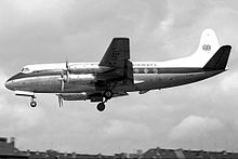 In early 1961, BUA applied to the Air Transport Licensing Board (ATLB),[35][36][37] a predecessor of the Civil Aviation Authority (CAA), for a large number of domestic and international short-, medium- and long-haul scheduled route licences to give its scheduled network the critical mass to become financially viable by 1965, and to provide sufficient work for a planned £20 million fleet of new jets comprising four long-haul Vickers VC10s and five short-/medium-haul DH 121 Tridents. BUA's applications included a request for twice-weekly all-economy/colonial coach class flights linking Gatwick with Istanbul, Teheran, Karachi, Delhi, Calcutta, Bangkok and Singapore, with a weekly extension to Hong Kong and Tokyo, respectively. BUA intended to inaugurate its first-ever scheduled services to Asia with DC-6Cs or Britannias, which were to be replaced with the new VC10s at a later stage. The airline planned to charge standard IATA fares on all sectors. In addition, it proposed to offer British residents flying to Singapore and Hong Kong in Skycoach[nb 6] an 18% discount on the equivalent economy class fares.[18][21][22][28][29][30][38][39] In May of that year, BUA became the first independent airline in the UK to launch a brand-new jet aircraft, when it placed an order for ten short-/medium-haul BAC One-Eleven 200 series.[2][40][41][42][43] The same month, the airline placed an order for four Vickers VC10 long-haul jets costing £2.8 million apiece.[44][45][46][47][48][49] Laker personally negotiated these orders with both manufacturers. The combined order value was £20 million.[50] At that time, the ATLB conducted a hearing into BUA's applications for over 20 scheduled route licences to enable it to expand the European network to include a number of major trunk routes from its Gatwick base, such as Gatwick to Paris, Milan, Zürich, Amsterdam and Athens, in competition with existing services of BEA from Heathrow.[30][51] Although the ATLB granted BUA the requested licences for 12 of these routes, the airline was unable to use them without actual traffic rights.[52] [53] These needed to be negotiated on its behalf between the UK Government and its overseas counterparts.[53][54] Following the ATLB's decision, BUA commenced scheduled services between Gatwick and Tenerife in October 1961 using Viscounts.[55][56][57] The same month, the airline started Viscount trooping flights from Gatwick to Germany under contract to the MoD.[58][59]