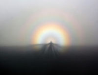 Then the towering buttresses of Batian and Nelion appeared; the rays of the setting sun broke through and, in the east, sharply defined, a great circle of rainbow colours framed our own silhouettes. It was the only perfect Brocken Spectre I have ever seen.[3]