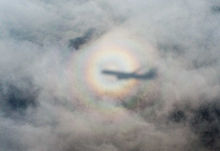 A Brocken spectre (German Brockengespenst), also called Brocken bow or mountain spectre, is the apparently enormous and magnified shadow of an observer, cast upon the surfaces of clouds opposite the sun. The head of the figure is often surrounded by the glowing halo-like rings of a glory—rings of coloured light that appear directly opposite the sun when sunlight meets a cloud of uniformly-sized water droplets.