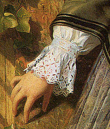 Broderie anglaise is characterized by patterns composed of round or oval holes, called eyelets, which are cut out of the fabric, then bound with overcast or buttonhole stitches.[1] The patterns, often depicting flowers, leaves, vines, or stems, are further delineated by simple embroidery stitches made on the surrounding material. Later broderie anglaise also featured small patterns worked in satin stitch.[2]