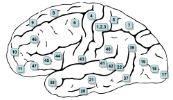 Distinctive features (Brodmann-1905): compared to Brodmann area 6-1909, area 8 has a diffuse but clearly present internal granular layer (IV); sublayer 3b of the external pyramidal layer (III) has densely distributed medium-sized pyramidal cells; the internal pyramidal layer (V) has larger ganglion cells densely distributed with some granule cells interspersed; the external granular layer (II) is denser and broader; cell layers are more distinct; the abundance of cells is somewhat greater.[1]