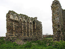 Bromholm Priory, also known as Bacton Abbey,[1] was founded in 1113 by William de Glanville, Lord of Bacton, and was originally subordinate to Castle Acre Priory until 1195 when it was exempted by Pope Celestine III. King Henry III visited the priory in 1223 to take the holy waters and dedicate to the relics; lands nearby were controlled by the all-powerful Justiciar Hubert de Burgh. From this priory we have the Bromholm Psalter dated to the early fourteenth century. The priory was suppressed in 1536. All that now remains are the ruins of the gatehouse, Chapter House, and the northern transept of the Priory Church.[1]