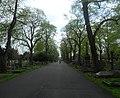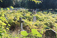 Although never envisaged as a park, JC Loudon devised the original planting scheme that was not fully realised, however, pines were imported from Poland with the prospect that in maturity they would cast shade over the graves.[28] There are over 60 species of trees, of which the limes are dated to 1838. The fact of the enclosure of the cemetery by a wall, has preserved almost intact, a distinct area of Victorian country flora. The adjacent West London line afforded a green corridor for many years, enriched by ballast from the South Downs when Counter's Creek was filled in and two railway lines constructed in mid-19th century, although a small wetland area was preserved by West Brompton station. However recent redevelopment along the station has further reduced local biodiversity and further reductions are planned with the major redevelopment of nearby Earls Court Exhibition Centre.[29]
