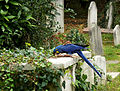 In the cemetery each season brings its features, like snow-drops and bluebells or wild lupin and foxgloves, broad-leaf pea, ferns and horse tail. There are small scale wooded areas and meadows. Since the land was used for market gardens, there are wild cabbages, asparagus and garlic among the slabs. A grape vine has fallen victim to maintenance. In Autumn, there can be a display of fungi, a mycologist's trove. The evergreens and ivy are a haven for birds and countless insects. Over 200 species of moth and butterfly have been identified in the cemetery. Despite the absence of a permanent water feature, there have been sightings of amphibians, notably a toad. Mammals are represented by bats, a range of rodents, including grey squirrels and one or two families of foxes. Among the birds, there is a long-standing population of carrion crows and several garden species with the addition of green woodpeckers and occasionally, nesting kestrels and ring-necked parakeets. The appearance of a female ring-necked pheasant in 2012 was short-lived.