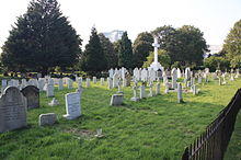 In the late 1880s when the nearby Earl's Court Exhibition Grounds played host to the American Show with Buffalo Bill, a number of Native American performers in the show, died while on tour in Britain.[21] The Sioux chief, Long Wolf, a veteran of the Oglala Sioux wars was buried here on 13 June 1892 having died age 59 of bronchial pneumonia. He shared the grave with a 17-month-old Sioux girl named White Star believed to have fallen from her mother's arms while on horseback. 105 years later a British woman named Elizabeth Knight traced his family and campaigned with them to have his remains returned to the land of his birth.[22] In 1997, Chief Long Wolf was finally moved to a new plot at Wolf Creek Cemetery (ancestral burial ground of the Oglala Sioux tribe) in Pine Ridge, South Dakota. His great grandson John Black Feather said "Back then, they had burials at sea, they did ask his wife if she wanted to take him home and she figured that as soon as they hit the water they would throw him overboard, so that's why they left him here."[3][23][24]