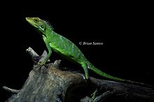 This species is a bright green lizard, sometimes possessing a blue tint on the head. It is able to change colour, turning darker brown when threatened. There is a dark ring around each eye, and a dark spot at the back of the head. The males have a crest on the neck. It has a very long and thin tail (75% of total length). The body length is of 13 cm (5.1 in), and the total length (body + tail) is of 57 cm (22 in).