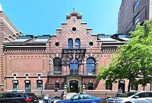 Brooklyn Heights' first library was founded in 1857 by the Mercantile Library Association of the City of Brooklyn. The first BPL branch in the neighborhood, the Montague Street branch, was opened in 1903. The Brooklyn Heights branch building at 280 Cadman Plaza West opened in 1962 and originally contained an auditorium and children's room. It was renovated and expanded from 1990 to 1993, and upon the completion of the renovation, the Brooklyn Heights branch shared the site with the Business & Career Library.[50] In 2013, BPL announced its intent to sell 280 Cadman Plaza West, and as part of this announcement, the Business and Career Library's functions were relocated to BPL's Central Branch.[51] BPL then sold the Brooklyn Heights branch to developer Hudson Companies.[52][53] Hudson Companies then demolished the structure and replaced it with a 34-story condominium, which would contain a smaller library at its base when it is completed in 2020.[49] In the interim, the BPL branch moved to the temporary 109 Remsen Street location.[54]