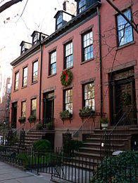 Brooklyn Heights was the first neighborhood protected by the 1965 Landmarks Preservation Law of New York City. The neighborhood is largely composed of blocks of picturesque rowhouses and a few mansions. A great range of architectural styles is represented, including Greek Revival, Italianate, Second Empire, Victorian Gothic, Romanesque, Neo-Grec, and Classical Revival, as well as a few 2/1/2-story late Federal houses from the early 19th century in the northern part of the neighborhood.[25] Some houses were constructed of brick, but the dominant building material was brownstone or "Jersey freestone", a reddish-brown stone from Passaic County, New Jersey.[16]