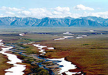 The Brooks Range forms the northernmost drainage divide in North America, separating streams flowing into the Arctic Ocean and the North Pacific. The range roughly delineates the summer position of the Arctic front. It represents the northern extent of the tree line, with little beyond isolated balsam poplar stands occurring north of the continental drainage divide. Trembling aspen and white spruce also occur north of the Brooks Range, though they are limited to sites that have been disturbed by human activity.[6][7] Southern slopes have some cover of black spruce, Picea mariana, marking the northern limit of those trees.[8] As the global mean temperature increases, tree line has been observed to move further north, changing the boundaries of where these trees are found.[9] An increase in shrub abundance is also being experienced in areas which were previously dominated by tundra, impacting the ecology of the area[10][11].