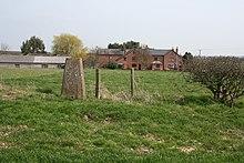 Several buildings within the parish are listed at grade II, the lowest of the three grades.[18] The oldest listed building is Top of the Town, off Heatley Lane, a farmhouse dating originally from the early 17th century. It has projecting end bays and a tiled roof, and is part roughcast over brick and part timber framed, featuring some close studding with a middle rail.[19] Two farmhouses on Heatley Lane are listed: Heatley is an L-shaped, red-brick building with a slate roof, dating from around 1750, and The Coronerage is a roughcast brick building with a tiled roof, dating originally from the early 19th century. Each has a front porch with decorative barge boards, topped with a finial.[20][21] Mickley Bridge is a blue-brick-and-stone accommodation bridge over the Shropshire Union Canal, dating from around 1826,[22] and a nearby cast-iron canal milepost is also listed.[23] Additionally, the remains of a moat are visible south east of Mickley Hall.[2][3][24]