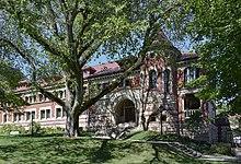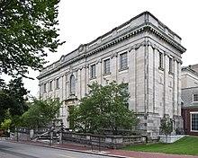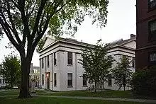 The John Hay Library is the second oldest library on campus. It was opened in 1910 and named for John Hay (class of 1858, private secretary to Abraham Lincoln and Secretary of State under two Presidents) at the request of his friend Andrew Carnegie, who contributed half of the $300,000 cost of the building.[53] It is now the repository of the university's archives, rare books and manuscripts, and special collections. Noteworthy among the latter are the Anne S. K. Brown Military Collection[54] (described as "the foremost American collection of material devoted to the history and iconography of soldiers and soldiering"), the Harris Collection of American Poetry and Plays (described as "the largest and most comprehensive collection of its kind in any research library"), the Lownes Collection of the History of Science (described as "one of the three most important private collections of books of science in America"), and (for popularity of requests) the papers of H. P. Lovecraft. The Hay Library is home to one of the broadest collections of incunabula (15th-century printed books) in the Americas, as well as such rarities as the manuscript of Orwell's Nineteen Eighty-Four and a Shakespeare First Folio. There are also three books bound in human skin.[55]