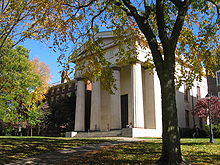 On September 8, 1803, the Corporation voted, "That the donation of $5000 Dollars, if made to this College within one Year from the late Commencement, shall entitle the donor to name the College." That appeal was answered by College treasurer Nicholas Brown, Junior, in a letter dated September 6, 1804, and the Corporation honored its promise. "In gratitude to Mr. Brown, the Corporation at the same meeting voted, 'That this College be called and known in all future time by the Name of Brown University'."[25] Over the years, the benefactions of Nicholas Brown, Jr., totaled nearly $160,000, an enormous sum for that period, and included the buildings Hope College (1821–22) and Manning Hall (1834-35).