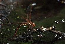 The brown hawker (Aeshna grandis) is a large dragonfly about 73 millimetres (2.9 in) long. It is a distinctive species and is easily recognised, even in flight, by its brown body and bronze wings. At rest, blue spots on the second and third segments of the male's abdomen can be noticed; these are absent in female.