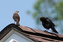 The brown-headed cowbird (Molothrus ater) is a small obligate brood parasitic icterid native to temperate and subtropical North America. They are permanent residents in the southern parts of their range; northern birds migrate to the southern United States and Mexico in winter, returning to their summer habitat around March or April.[2]