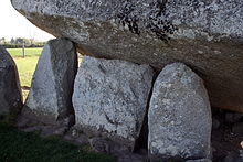 Brownshill Dolmen (Dolmain Chnoc an Bhrúnaigh in Irish) is a very large megalithic portal tomb situated 3 km east of Carlow, in County Carlow, Ireland. Its capstone weighs an estimated 100 metric tons, and is reputed to be the heaviest in Europe.[1] The tomb is listed as a National Monument.[2] Known as the Kernanstown Cromlech, sometimes spelled as Browneshill Dolmen, it is sited on the former estate house of the Browne family from which it takes its name.[3] The tomb was built between 4000 and 3000 BC. It is distinguished for the flanking of its burial chamber with two large upright stones (orthostats) supporting the granite capstone (roof) of the chamber. The capstone is thought to have been covered by an earthen mound and a gate stone blocked the entrance. At Brownshill both portal stones and the gate-stone are still in situ; the capstone lies on top of the portals and gate-stone and slopes to the ground away from the entrance.