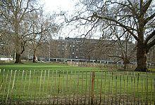 Brunswick Square is a 3-acre (1.2 ha) public garden and ancillary streets along two of its sides in Bloomsbury, in the London Borough of Camden. It is overlooked by the School of Pharmacy and the Foundling Museum to the north; the Brunswick Centre to the west; and International Hall (a hall of residence of the University of London) to the south. East is an enclosed area of playgrounds with further trees, Coram's Fields, associated with charity Coram Family which is just over double its size; next to that area Brunswick Square is mirrored, symmetrically by Mecklenburgh Square, likewise of 3 acres including roads. The squares are named after contemporary Queen consorts (the wife of George III and the wife of his eldest son George IV).