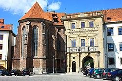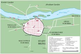 The town of Brzeg was first mentioned as a trading and fishing settlement in the year 1234.[3] In 1248, Silesian Duke Henry III the White granted the settlement Magdeburg town rights and by the late 13th century the city became fortified. Sometimes referred to as “the garden town”, the town's size greatly expanded after the construction of dwelling houses which were located on the city outskirts. From the early 14th to late 17th centuries, the town was ruled by the Piast dynasty as fiefs of the Bohemian Crown within the Holy Roman Empire. Later, as the result of the Silesian Wars, the town became Prussian. After the border shifts of 1945, the town's German populace was expelled and the town became part of Poland.