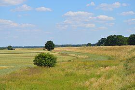 The settlement of Brzeg, historically located in the regional unit of Lower Silesia as opposed to Upper Silesia, is due to the formation of a "przesieka" ("clearing"). The "clearing" was a lateral formation, extending northerly from the former Sudetes Wildland to the southern foothills of the Sudetes Mountains.[28] The clearing's characteristics set it as a point for defence in the Lower Silesia region, lined with barrages made out of cut down woodland.[29] The Brzeg Plain was settled due to its fertile soil, allowing for the earliest forms of agriculture to develop in the locality. The locality was first settled by Silesian tribes and in later history, until 1675, by the Piast duchies of Duchy of Brzeg, Legnica and Wołów, united under the Duchy of Legnica-Wołów-Brzeg. Presently, the region is spotted with numerous towns, including Brzeg, Grodków and Strzelin, as well as villages, with agriculture providing the major source of income. The development of agriculture is met with a lack of forested areas, apart from the Stobrawa Landscape Park, located 7.2 km to the north of Brzeg and the Oder river. The Stobrawa woodland, agriculture and the Oder (as a form of transport) provided Brzeg the necessary diversity to remain the regional trade capital in Silesia.[30][15]