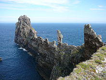 The placing of Balor's stronghold on Tory Island derives from the medieval literature, which places the Fomorians' stronghold there.[1] On Tory Island there are geological features called Dún Bhalair ("Balor's fortress") and Túr Bhalair ("Balor's tower"),[1] and a tall rock formation called Tór Mór ("great tower").[40]