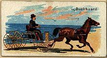 A buckboard is a four-wheeled wagon of simple construction meant to be drawn by a horse or other large animal. A distinctly American utility vehicle, the buckboard has no springs between the body and the axles.[1] The suspension is provided by the flexible floorboards of the body and a leaf spring under the seat(s). The buckboard has no sideboards on the body, leaving the floor quite mobile. In rough terrain, the floor can flex and "buck", lending the vehicle its name.