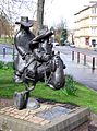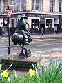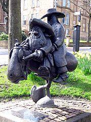 Statue erected by public subscription on 1 May 1992 to the memory of Bud Neill, 1911-1970, cartoonist & poet, creator of Lobey Dosser, Sheriff of Calton Creek, his sturdy steed El Fideldo, resident villain Rank Bajin, and many other characters.