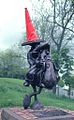 Unfortunately the statue has been subjected to occasional vandalism, and is often seen adorned with a traffic cone after weekend revellers have passed by, something that has come to be known as the traditional headwear of the Glasgow statue.[4] In April 2016, the statue had to be removed for repairs after reportedly being vandalised by "rank badyins".[5]