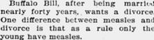 Cody filed for divorce in 1904, after 38 years of marriage.[51] This decision was made after years of jealous arguments, bad blood between his wife and his sisters, and friction between the children and their father. By 1891, Cody had instructed his brother-in-law to handle Frederici's affairs and property, stating "I often feel sorry for her. She is a strange woman but I don't mind her—remember she is my wife—and let it go at that. If she gets cranky, just laugh at it, she can't help it."[52] Cody hoped to keep the divorce quiet, so as to not disrupt his show or his stage persona, but Frederici had other ideas.