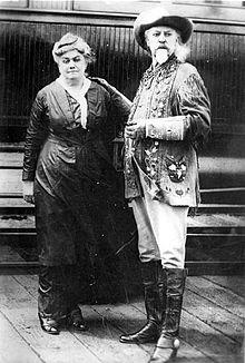 Cody's headline performers were well known in their own right. Annie Oakley and her husband, Frank Butler, were sharpshooters, together with the likes of Gabriel Dumont and Lillian Smith. Performers re-enacted the riding of the Pony Express, Indian attacks on wagon trains, and stagecoach robberies. The show was said to end with a re-enactment of Custer's Last Stand, in which Cody portrayed General Custer, but this is more legend than fact. The finale was typically a portrayal of an Indian attack on a settler's cabin. Cody would ride in with an entourage of cowboys to defend a settler and his family. This finale was featured predominantly as early as 1886 but was not performed after 1907; it was used in 23 of 33 tours.[27] Another celebrity appearing on the show was Calamity Jane, as a storyteller as of 1893. The show influenced many 20th-century portrayals of the West in cinema and literature.[19]